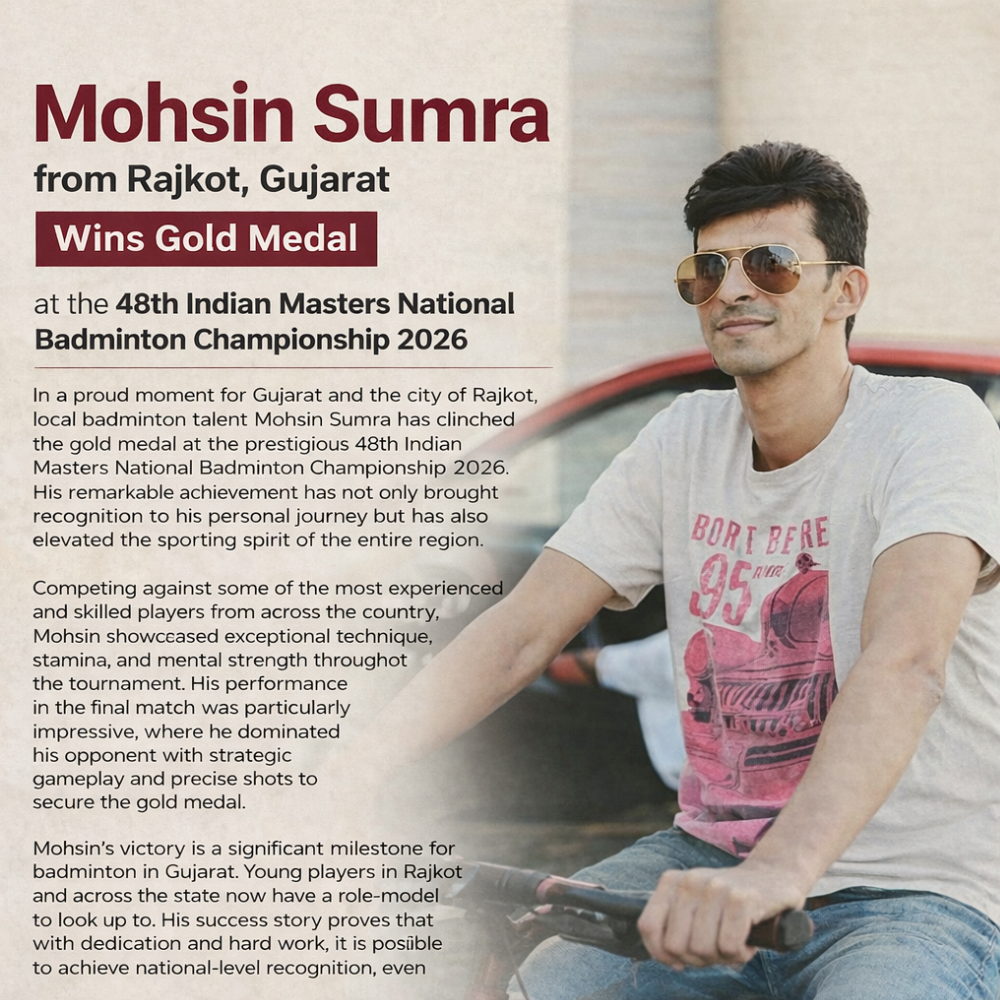 In a proud moment for Gujarat and the city of Rajkot, local badminton talent Mohsin Sumra has clinched the gold medal at the prestigious 48th Indian Masters National Badminton Championship 2026. His remarkable achievement has not only brought recognition to his personal journey but has also elevated the sporting spirit of the entire region.